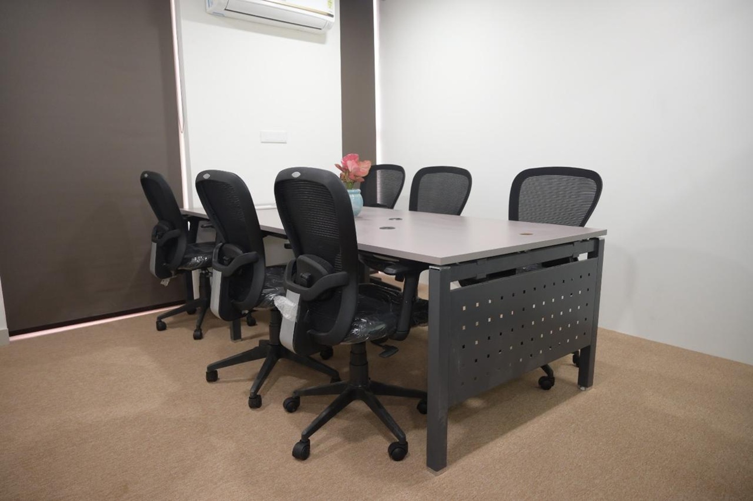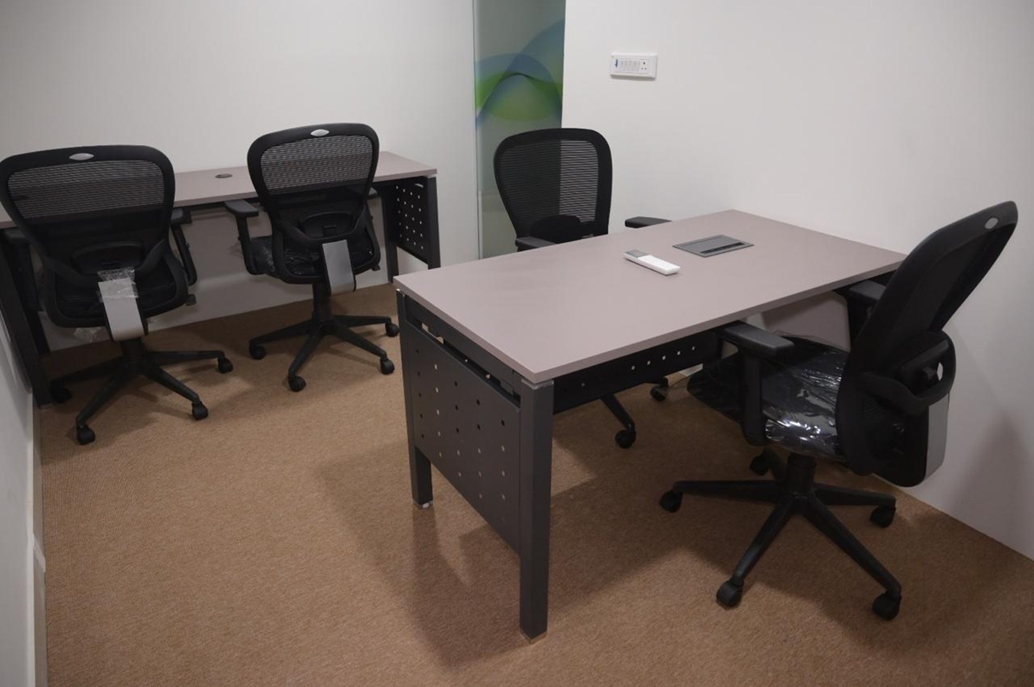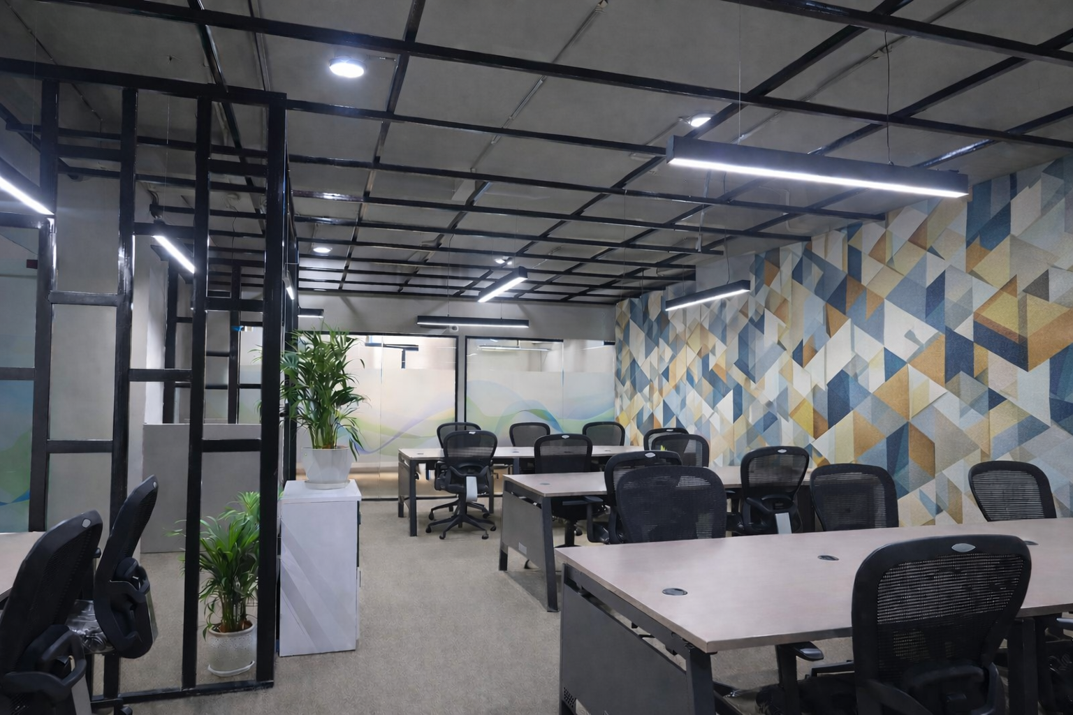 We designed a co-working office for Aarna Coworking & Business Hub, Jaipur with a modern aesthetic, featuring modular furniture, 19 open workstations, and 11 private cabins. The space includes a dedicated pantry, welcoming reception, and high-end glass partitions that elevate both functionality and style. It offers a contemporary environment tailored for productivity and collaboration.