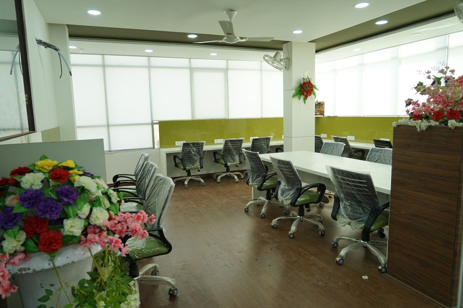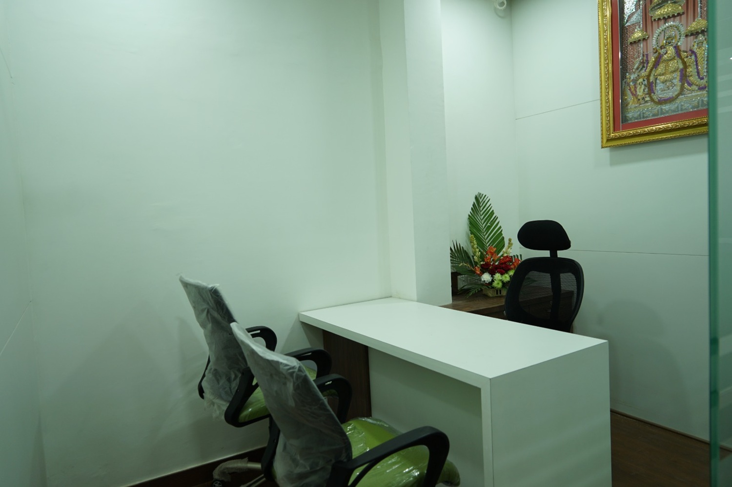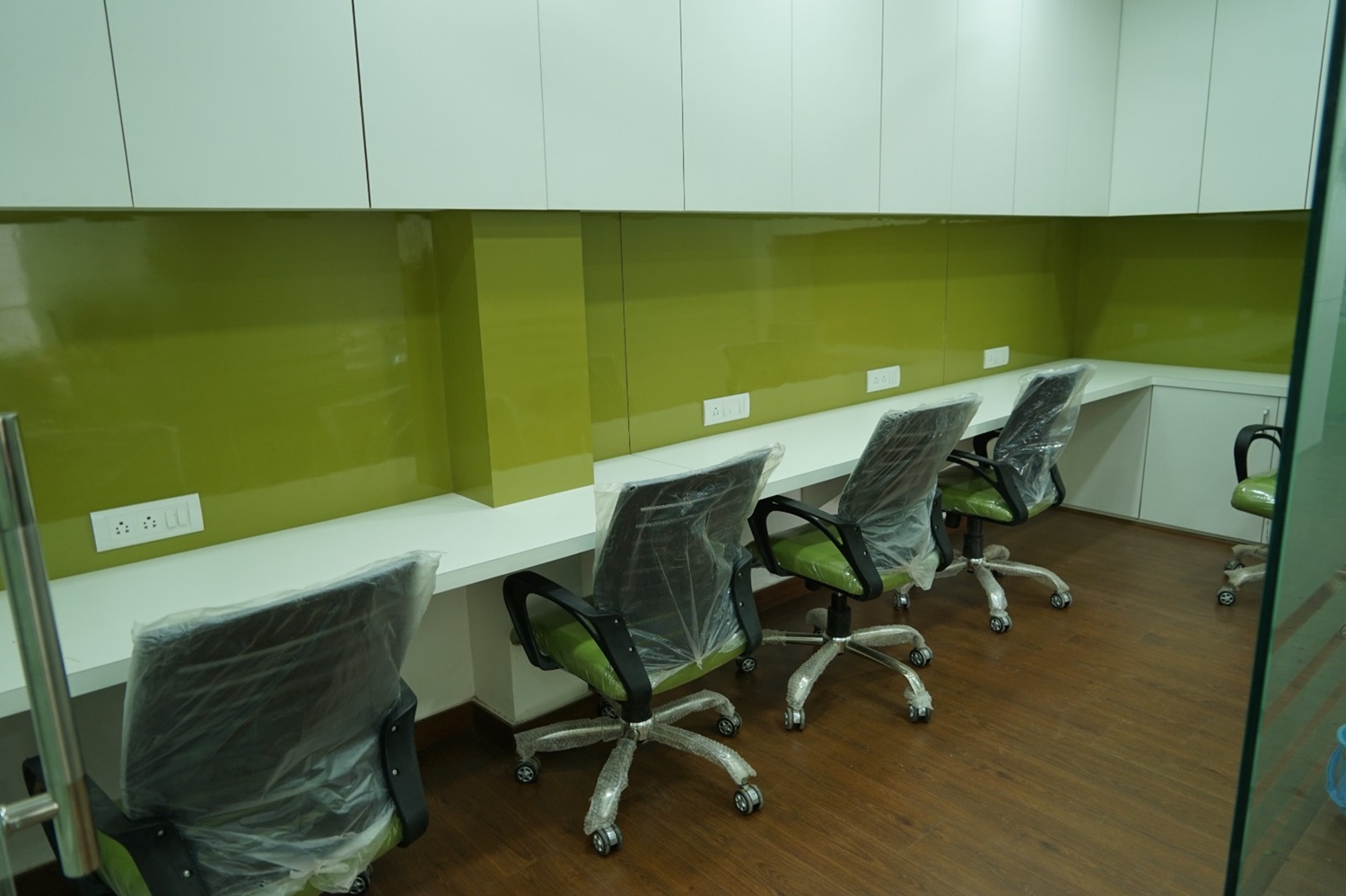 We designed a complete office for a leading real estate company, where a striking palette of white, green, and touches of brown set the tone. Modern cabins, efficient staff seating, and sleek glass partitions created a stunning workspace that quickly became a highlight in the business community. The interiors balance sophistication with functionality, reflecting contemporary corporate style.