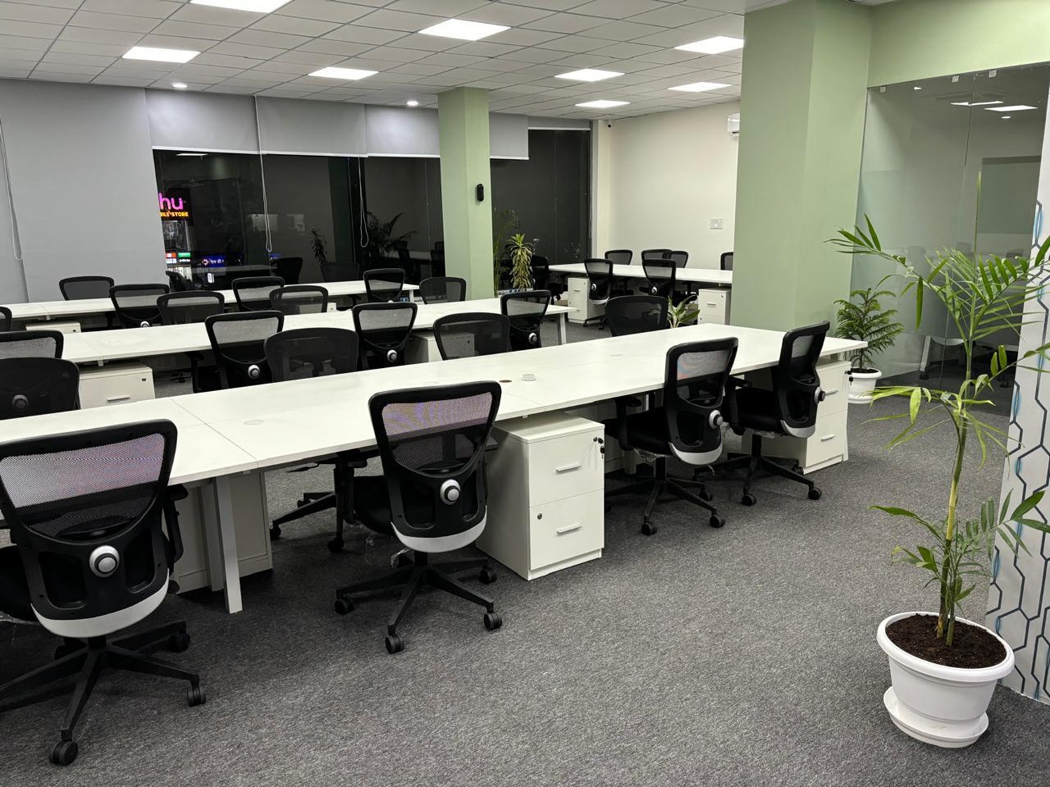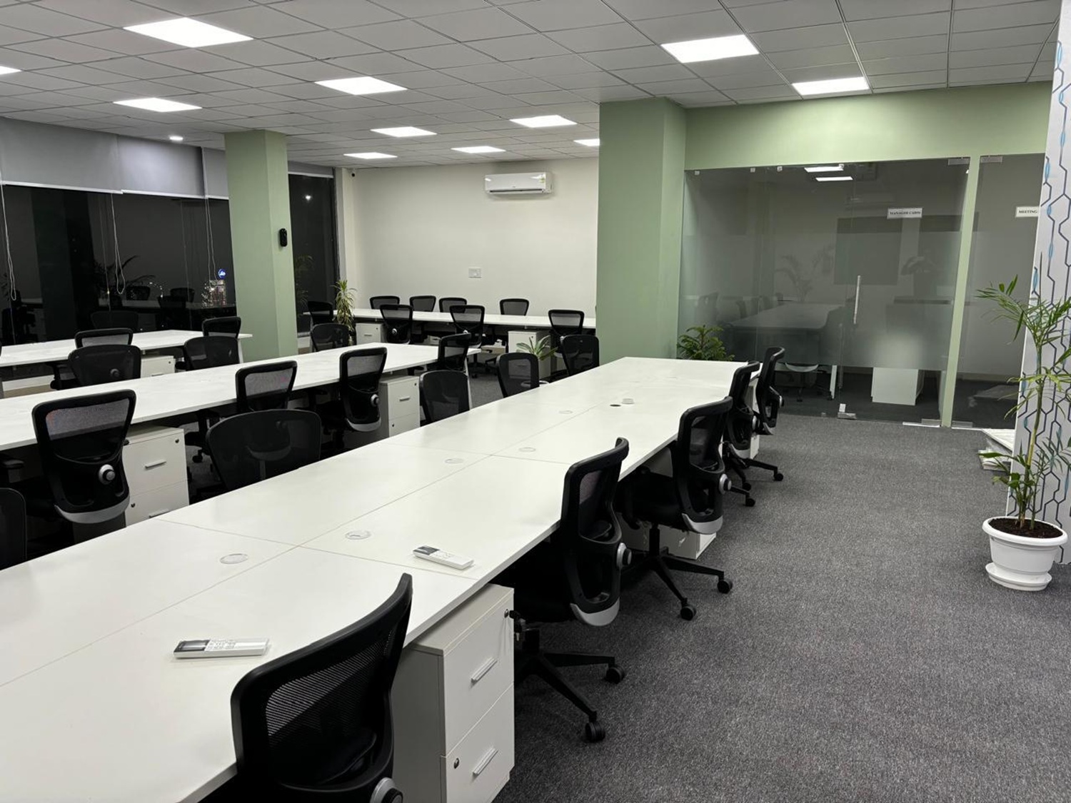 We designed a managed office for Aarna Co-working & Business Hub in Udaipur, tailored for an IT company across two customized floors. The pastel green and white theme, combined with open seating, private cabins, and high-end glass partitions, created a modern and spacious environment. Ample open areas and a dedicated recreation zone make the workspace both functional and refreshing.