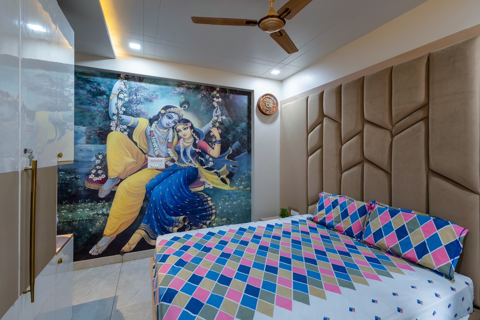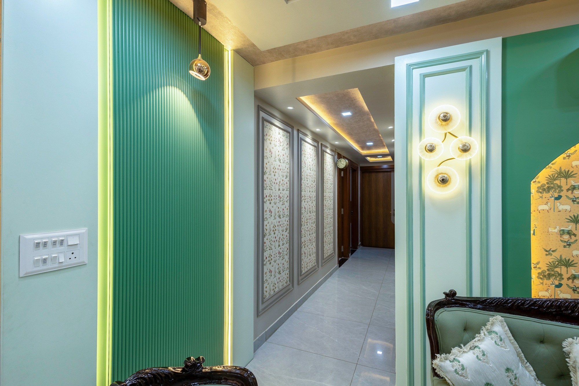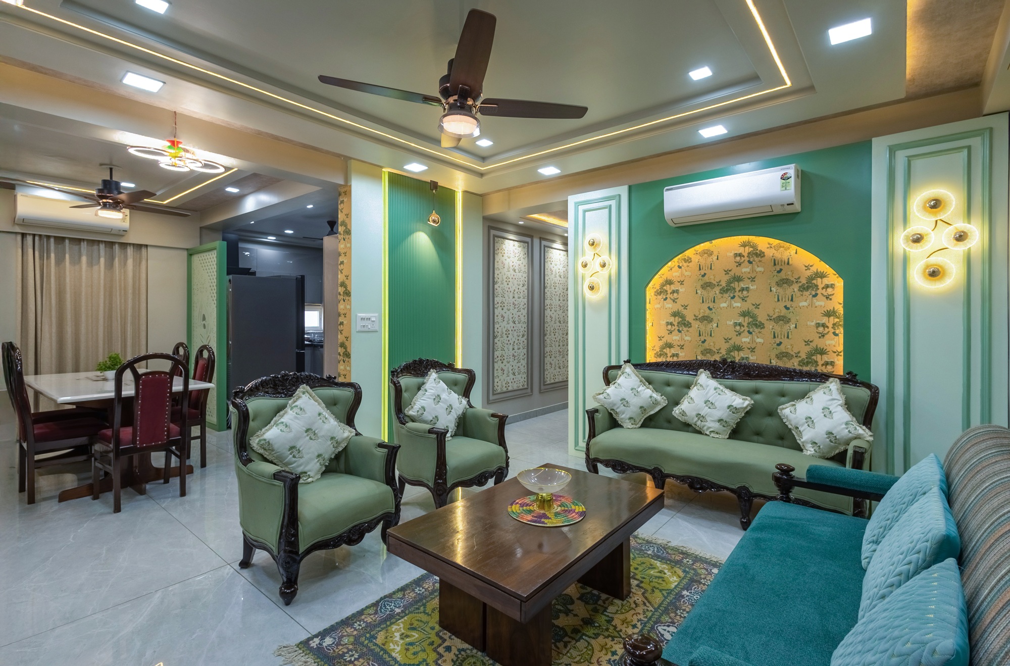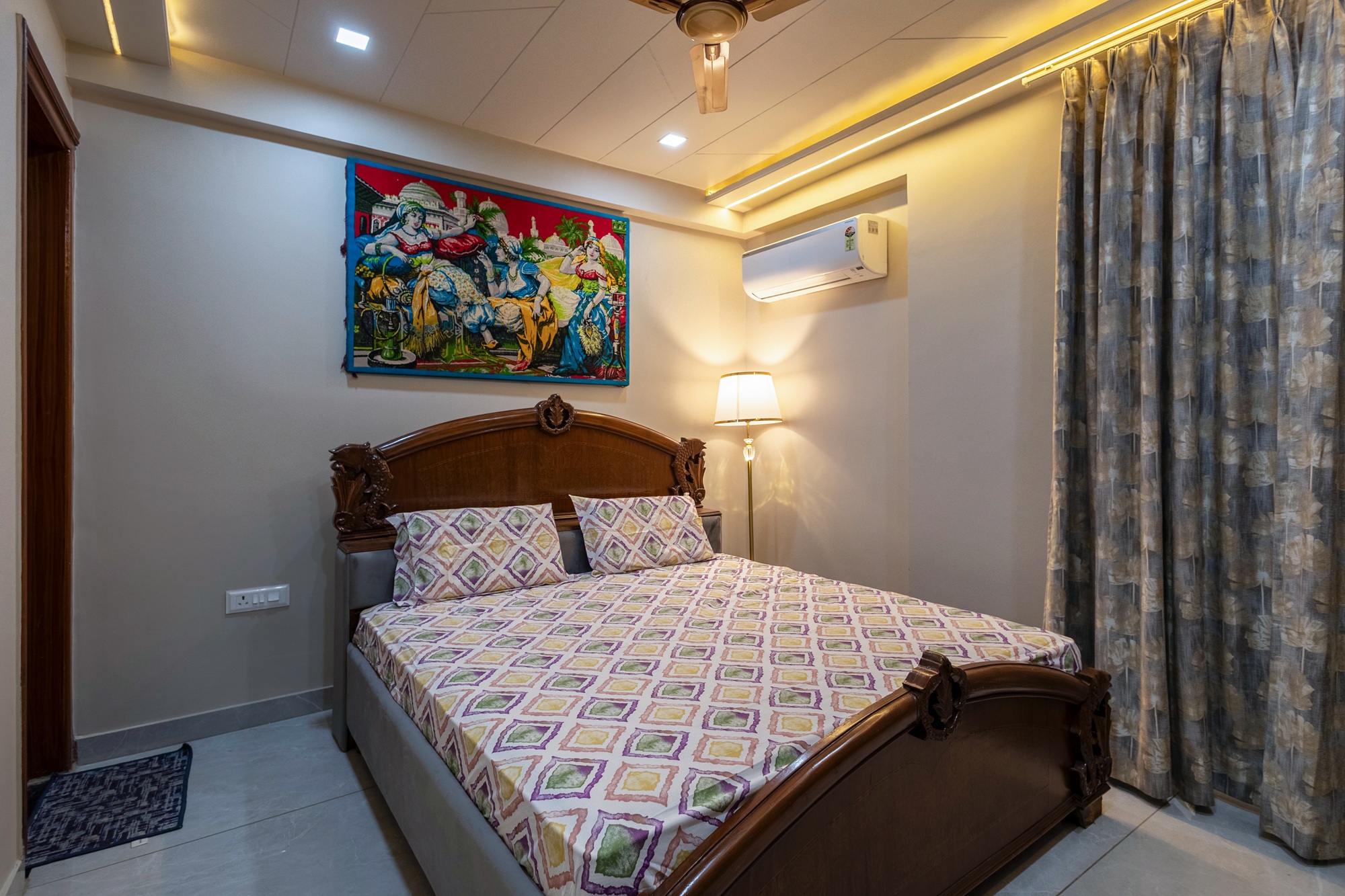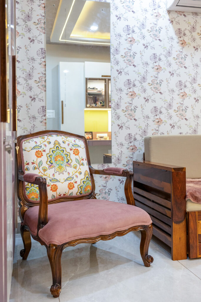 This 4-bedroom flat blends design with comfort, creating a modern yet inviting living space. Bright colours make the living area welcoming and lively, Antique furniture, traditional styling showcases the Rajputana Style of living. Each room is styled in rich tones, offering a serene and elegant atmosphere. Thoughtful interiors balance functionality with aesthetics, making the home both stylish and livable.