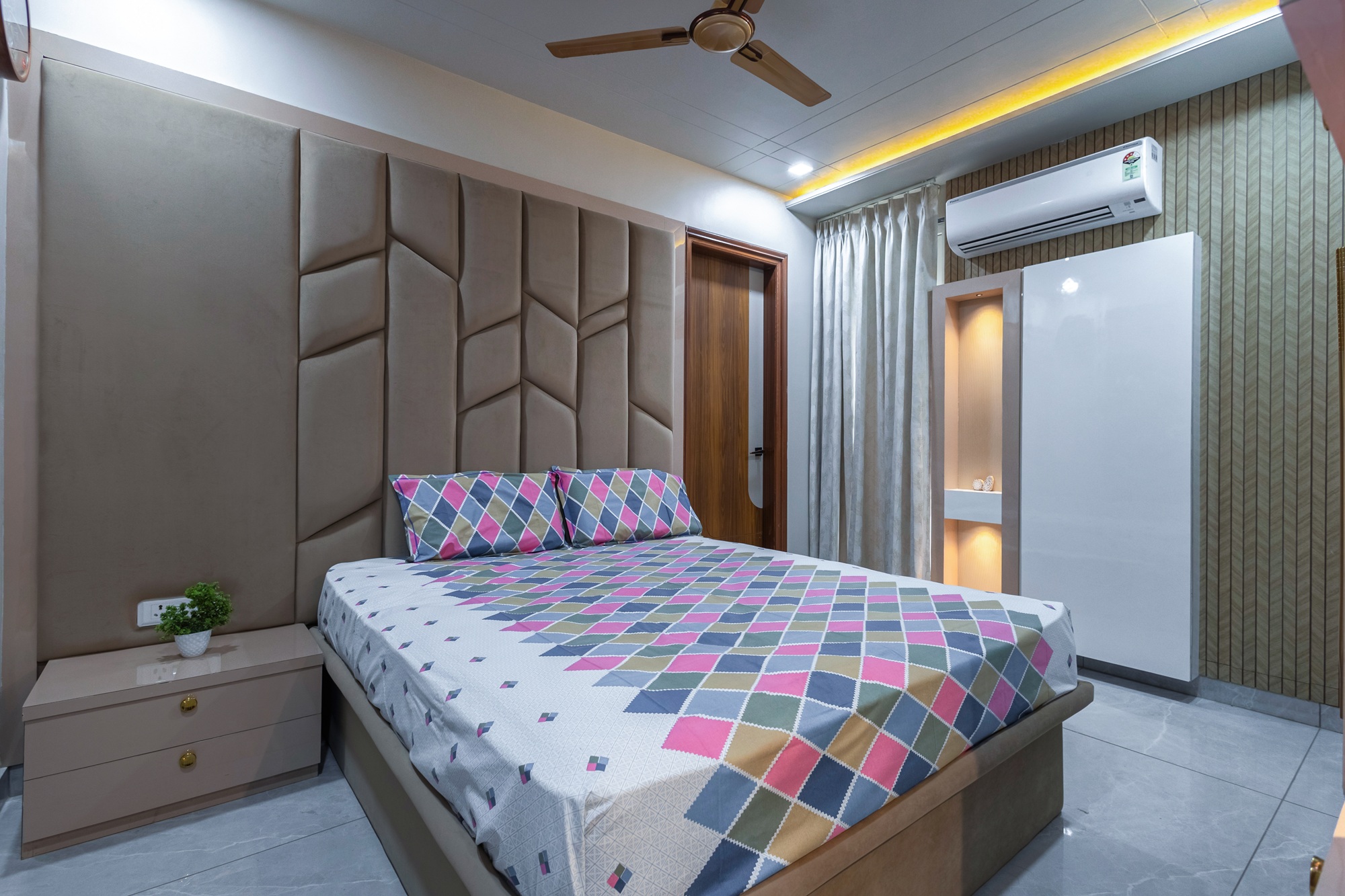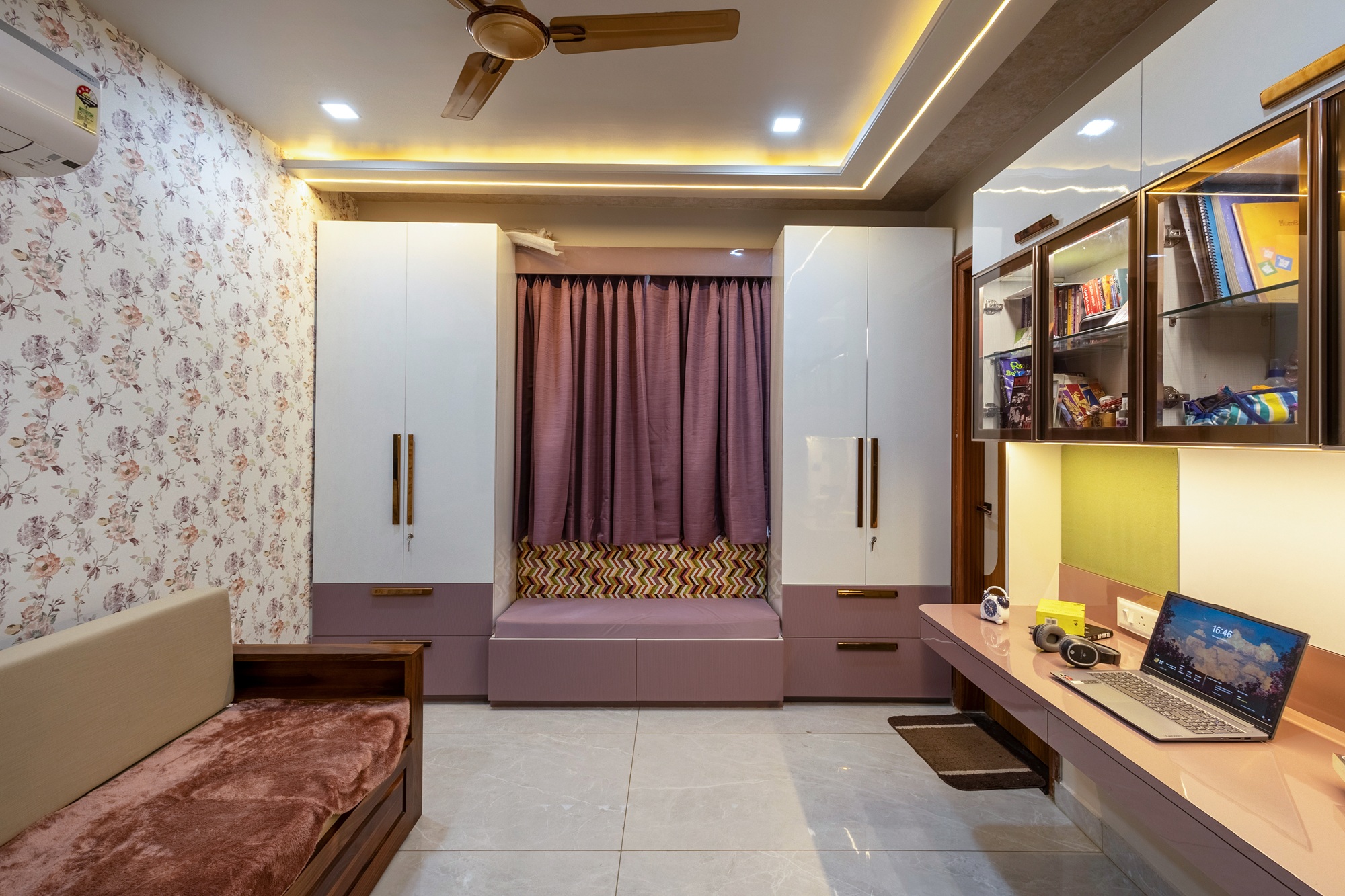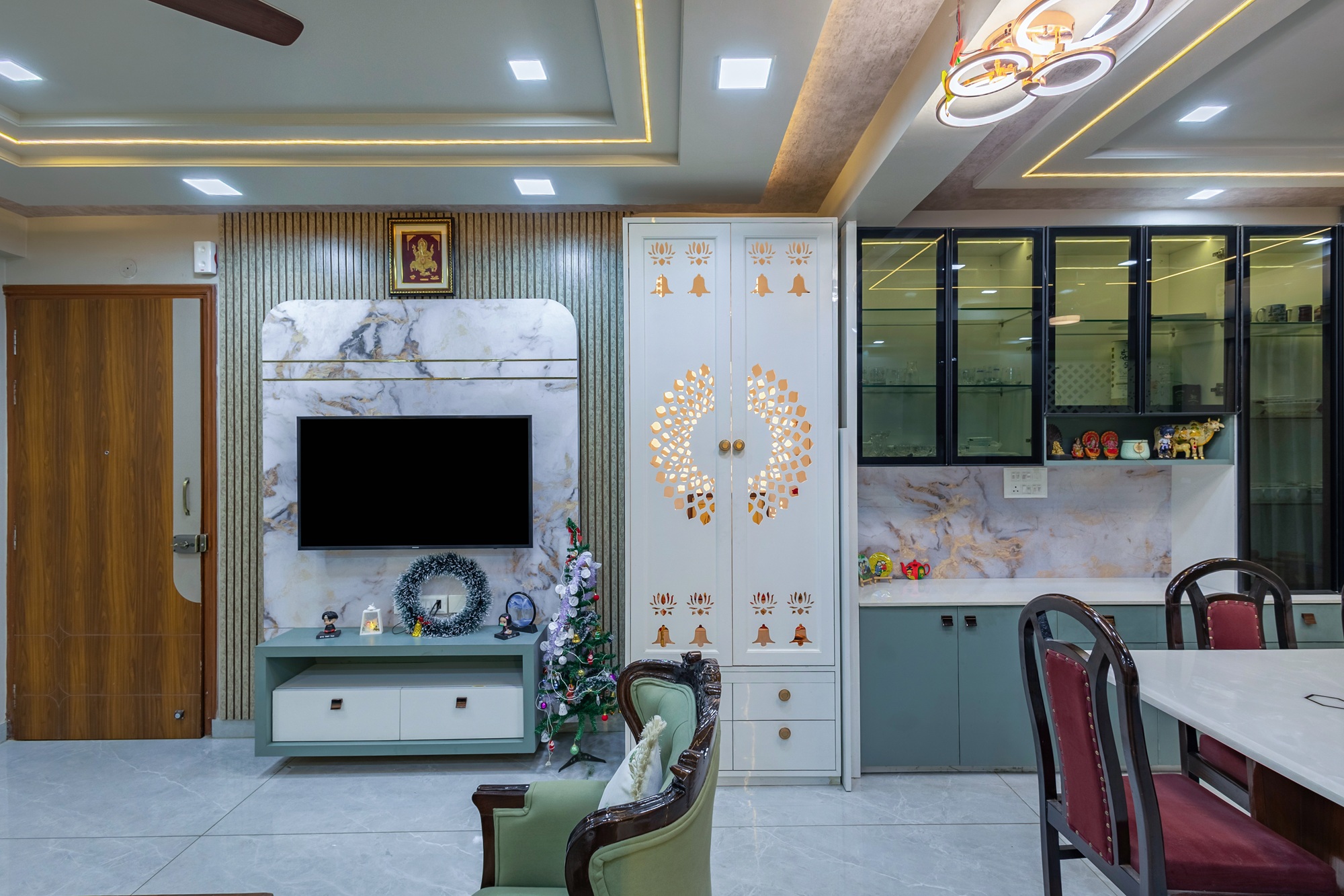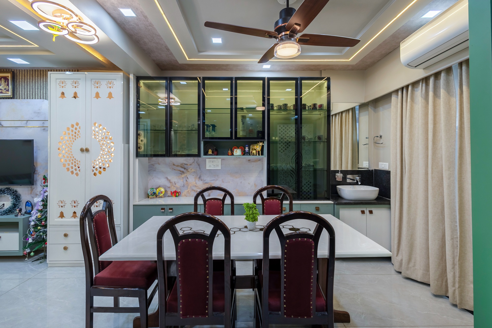 This 4-bedroom flat blends design with comfort, creating a modern yet inviting living space. Bright colours make the living area welcoming and lively, Antique furniture, traditional styling showcases the Rajputana Style of living. Each room is styled in rich tones, offering a serene and elegant atmosphere. Thoughtful interiors balance functionality with aesthetics, making the home both stylish and livable.